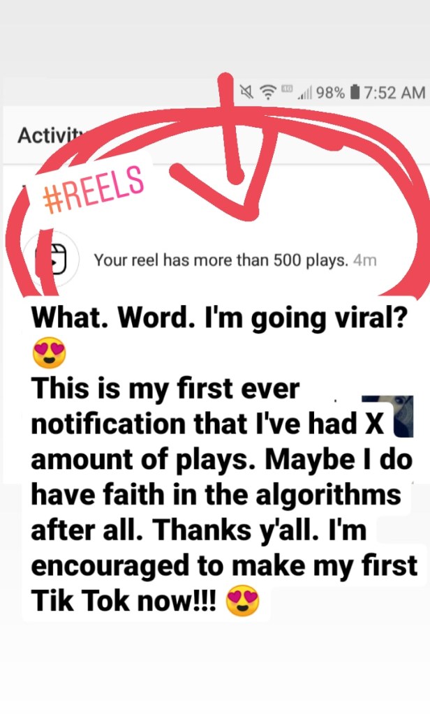 Woot! Update! My new poetry reel is going viral because I got my first ever notification that my reel has had 500 plays!! It hasn’t even been out 24 hours yet y’all!!! 😍😍😍😍😍