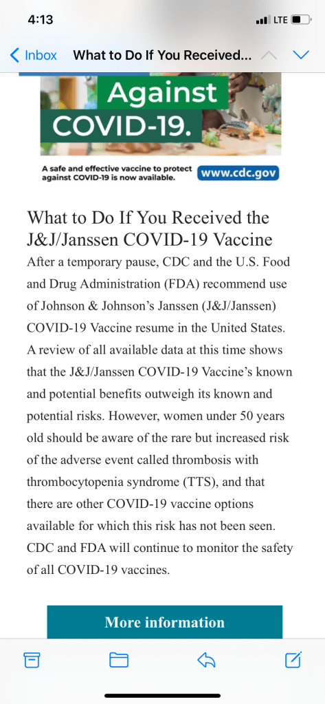 I already have heart issues, my BP dropped extremely low getting MODERNA dose 1 (so maybe a slight miracle I wasn’t offered the J&J, and the government likely wanted the MODERNA vaccines for the Soldiers, because it offers a 94% effective rate against COVID (but not the rapidly evolving strains), and let’s face it, a Soldier is a DOLLAR sign. We are only numbers. And many of us have unplugged and have come to learn this fact and they’re dying by suicide which is why the suicide rate continues to increase among veterans and active military). The government are building super soldiers and they spend a lot of money training us, that’s why they don’t want us to fucking die. They only care about stats and numbers! The J&J vaccine offers an 80% effective rate from COVID. MODERNA 94%. And I haven’t studied the other vaccines emerging. But I’m definitely glad I didn’t get the Johnson and Johnson one if it’s causing fucking blood clots and I already have heart issues!