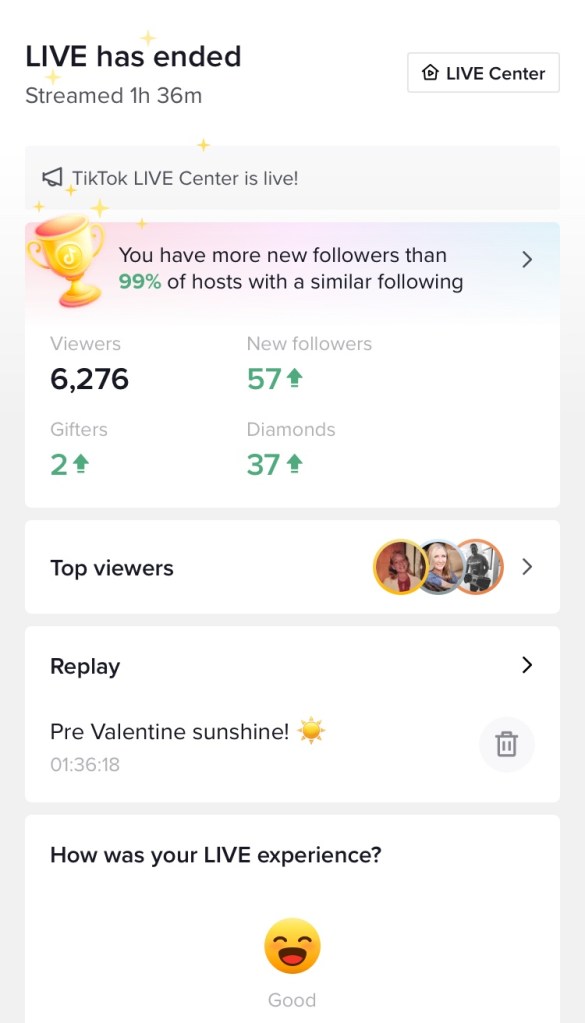Anyhoo. Hands down my best live. We went for a long beach walk and saw lots of stuff. I got fresh air, communication, and exercise. I earned some roses for Valentines. I had the most follows in this live and I think I got the most likes but I don’t remember what the overall total was. Tons of comments and viewers from all over.