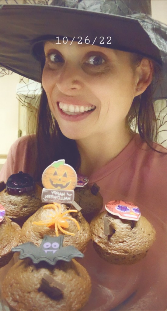 P.S. If you have those little spiders – the black and orange ones that hang on your Halloween decorations – you can use those for your cakes – but please don’t eat your wearable cake decorations – get photos in them instead or actually share the cupcakes and let folks keep the Halloween jewelry (or ask for them back) ๐คช