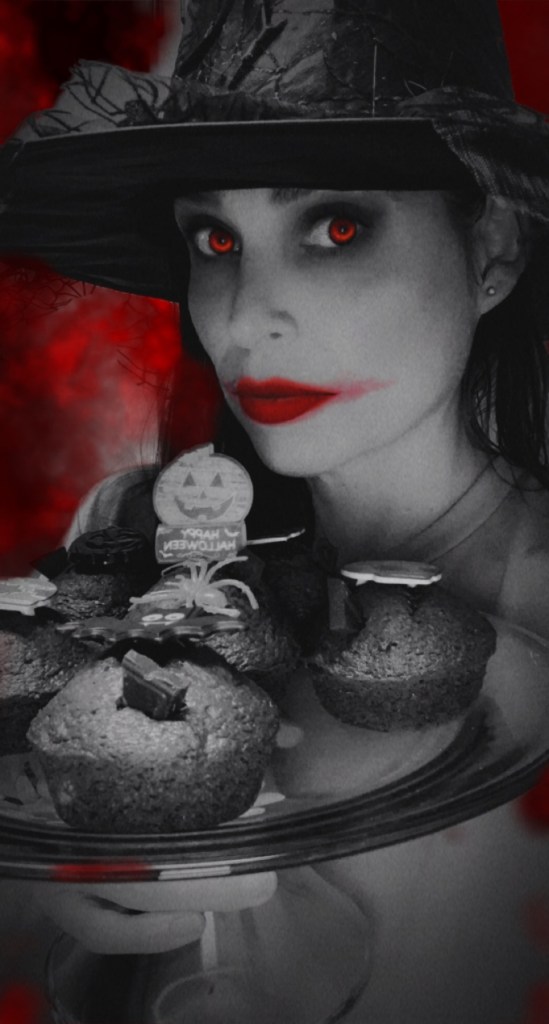 I made Dark chocolate cupcakes with dark chocolate “tombs” and decorated them with Halloween cake rings (that can be worn)