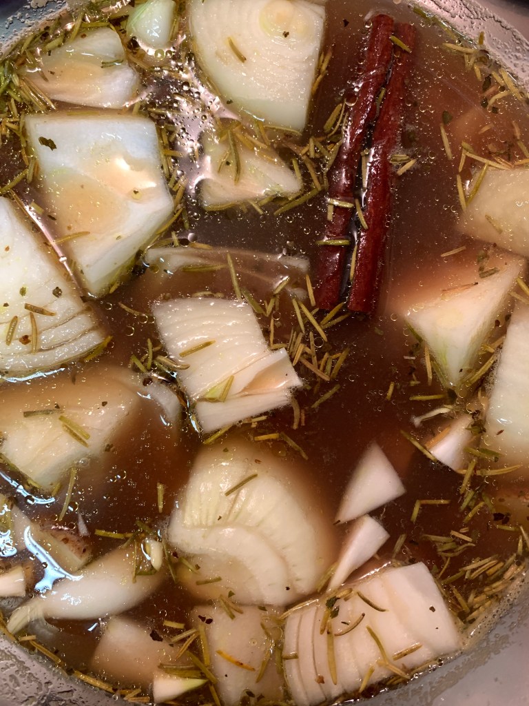 I dropped in a couple of my cinnamon spice sticks (secret ingredient for any stew) – along with many other spices and herbs