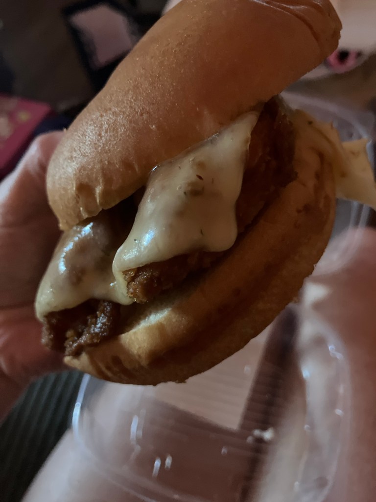 Got a hot meal to enjoy first – damn good fish sandwich from the deli