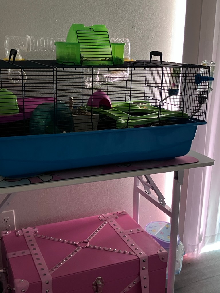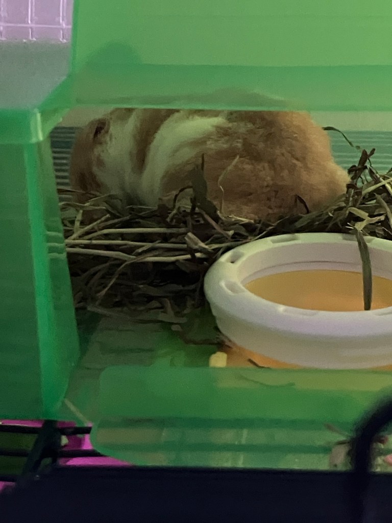 But I’ve since added a wooden wagon and he’s gonna have to be careful exploring tonight. Cuz I cleaned his area up, relocated items, filed down sharp spikes, cleaned his innie meany litter box, added fresh treats, but he ain’t drinking from his water bottles. I just wanna see him do it on his own.