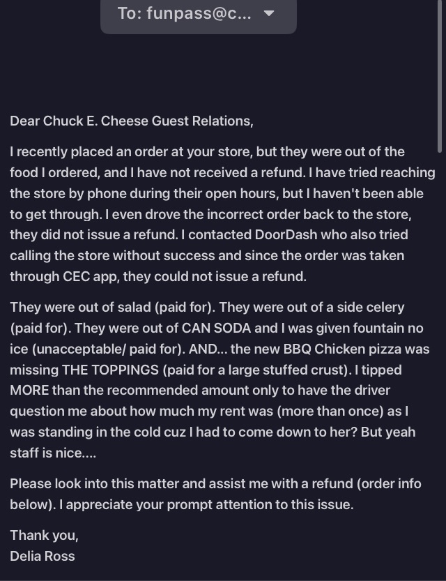 Also, “we’re out of salad, we can’t issue a refund” but I ordered direct through CEC